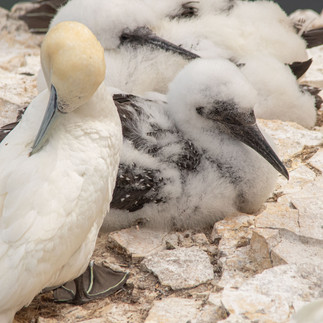 These are large elegant seabirds with heavy sharp bills and long wings. There was lots of these birds nests on the cliffs in many different stages in their life. The black birds are the chicks and as they moult their feathers they get gradually whiter, till they reach their full adult plumage. It can take up to 4 years for them to reach full adulthood.